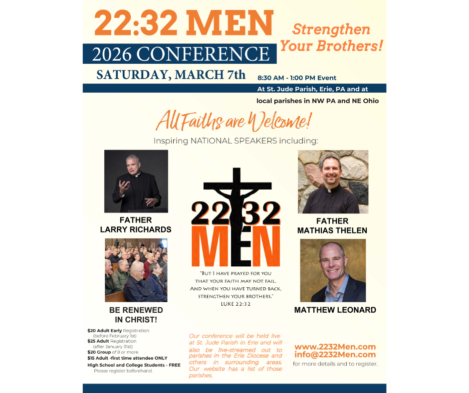 Location St. Jude Parish 2801 West 6th Street, Erie, PA Website http://www.2232men.com Date Mar 07 2026 Time 8:30 am - 1:00 pm 13th Annual 22:32 Men’s Conference Share this event + Add to Google Calendar + iCal / Outlook export 00 days 00 hours 00 minutes 00 seconds