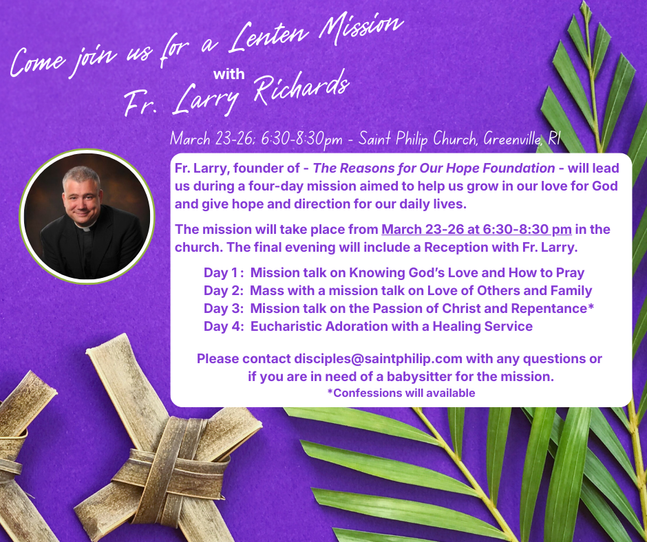 Date Mar 23 2026 Time 6:30 pm - 8:30 pm Parish Mission – St. Philip Parish, Greenville, RI Share this event + Add to Google Calendar + iCal / Outlook export 00 days 00 hours 00 minutes 00 seconds