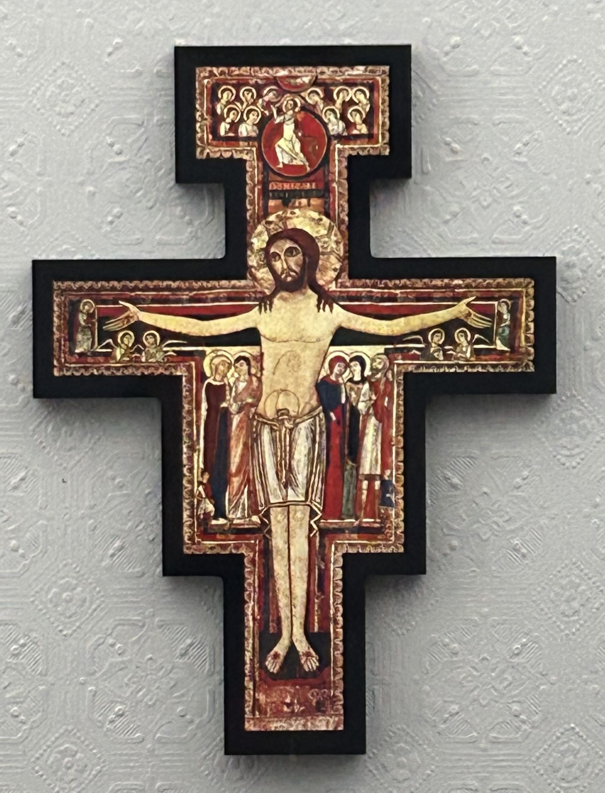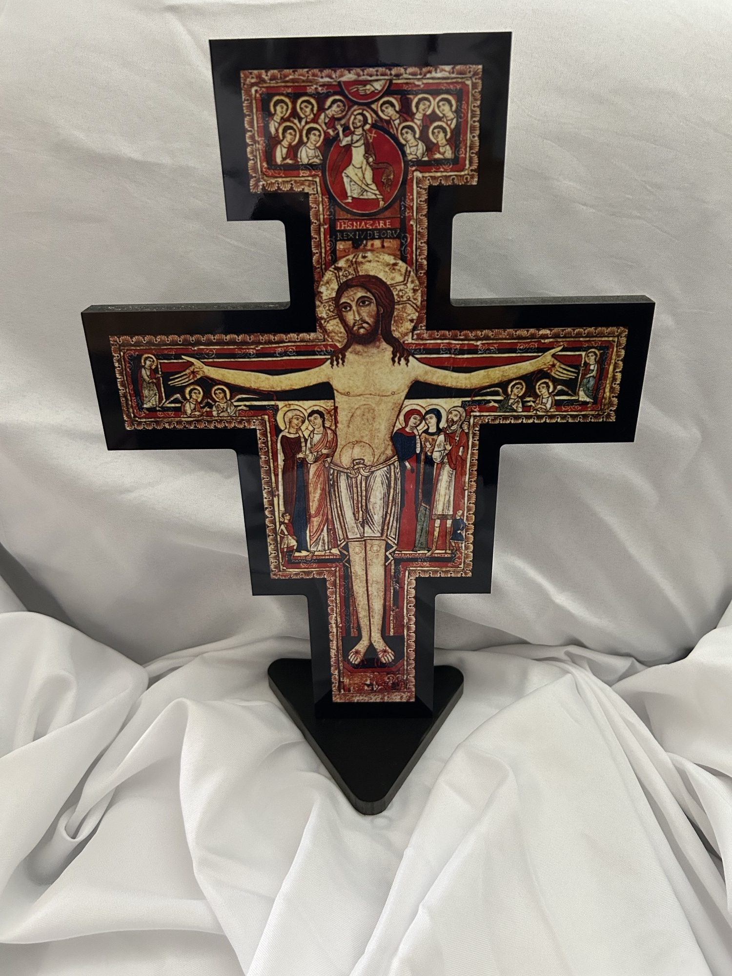 Adorn a chapel, wall, or work space with this modern take on a traditional image: the San Damiano Wall Plaque Cross. In the imagery, Christ crucified is portrayed pouring His Precious and salvific Blood upon Mary and the disciples as two soldiers pierce His hands. Above the crucified Christ, Jesus’ Resurrection is looked forward to as Christ the King greets His disciples. This cross made of black PVC featuring the classic San Damiano image has a matte finish and comes in variety sizes. It makes a perfect inspirational and meditational gift! The 15″ size will come with a plastic hook to hang it if you order it as a wall plaque cross, or a base to put it in if you order a pedestal cross.